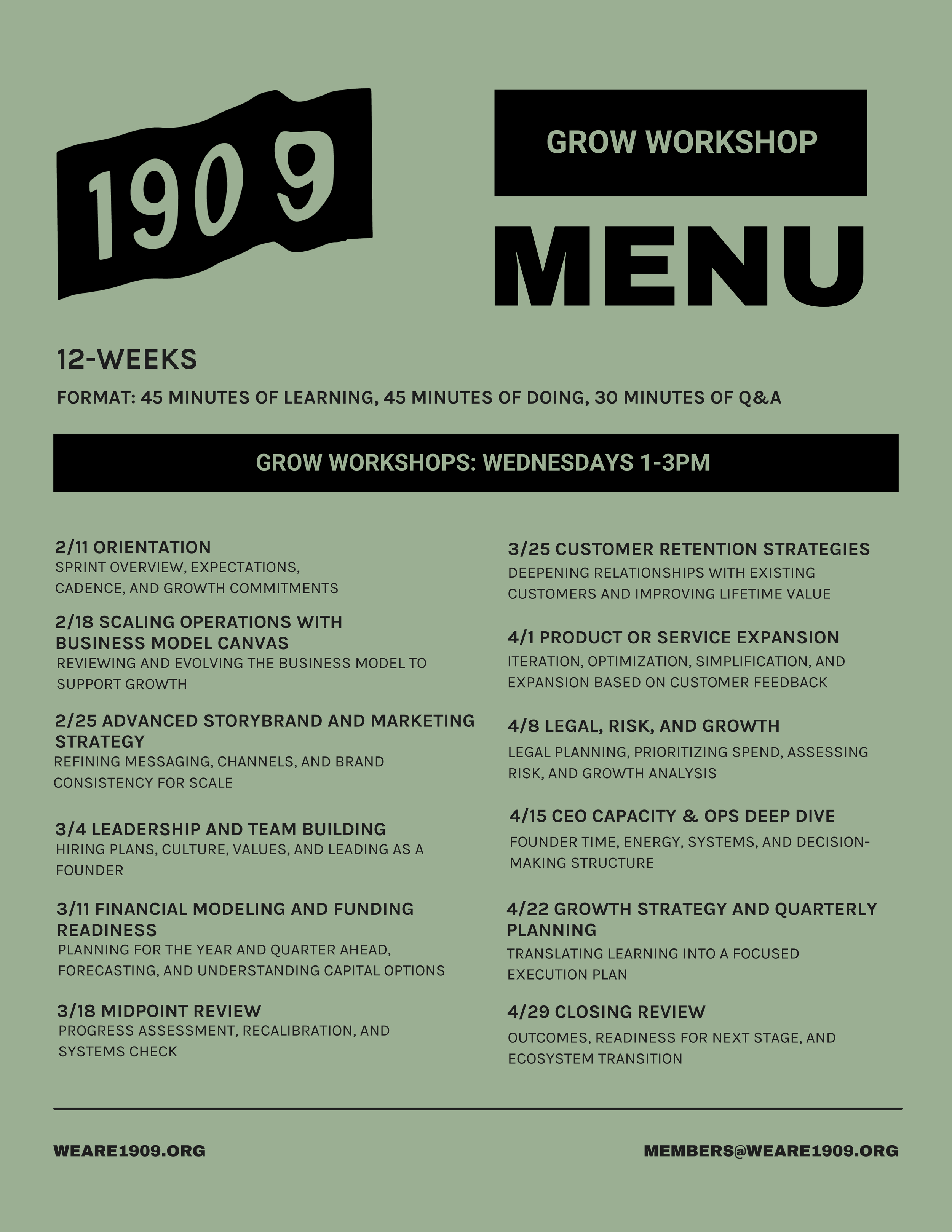 Our GROW tier is designed for companies that have $50-$250K in revenue. With the goal to help founders strengthen systems, deepen customer relationships, and build the capacity required to scale sustainably.